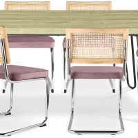 Cercate una composizione tavolo da pranzo con 6 sedie che assicuri comfort ai vostri ospiti o clienti del bar o dell'hotel e che arredi lo spazio con eleganza e stile? Il set Wanda è la soluzione giusta per voi. Il tavolo, in stile industriale, con gambe a forcina, è ampio e comodo. Le sedie, invece, sono in mesh, realizzate in rattan naturale. La morbida seduta in velluto dona all'insieme un aspetto confortevole che non potrete far mancare al vostro ristorante, al locale o in hotel.